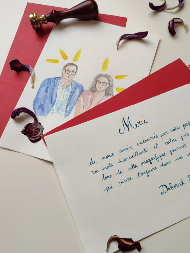 Que ce soit à l’avance avec votre faire-part, durant le mariage avec les marque-places ou du live-painting, ou après avec vos cartes de remerciement, faites de votre mariage un évènement original pour vos invités !